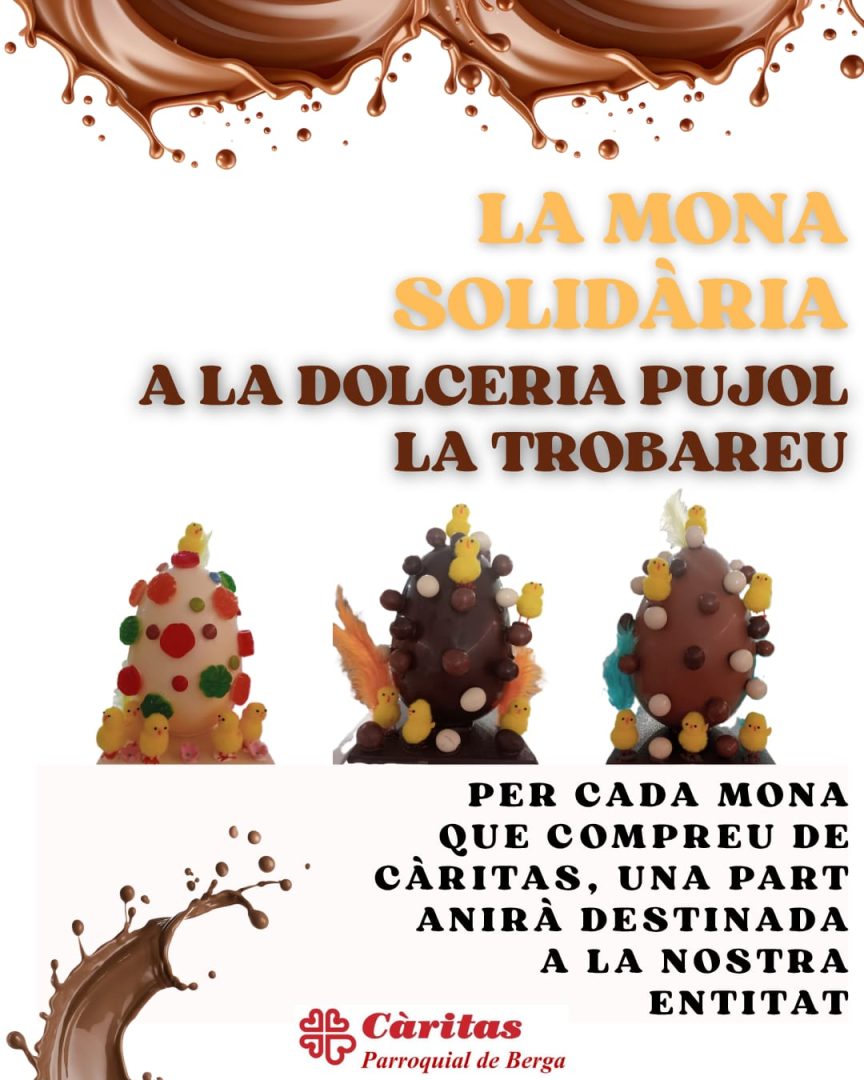 27 març, 2026 0 MONA SOLIDÀRIA Aquest any tenim una iniciativa solidària nova i ben dolça. A la Dolceria Pujol tindran mones que al comprar-les, una part anirà a benefici de Càritas Parroquial de Berga. Animeu-vos a col.laborar-hi.